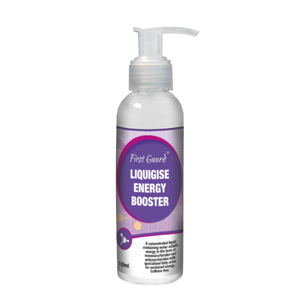 FIRST-GUARD™ – LIQUIGISE ENERGY BOOSTER: A concentrated liquid containing water-soluble energy in the form of monosaccharides and polysaccharides with specialized fatty acids for sustained energy. Caffeine free.